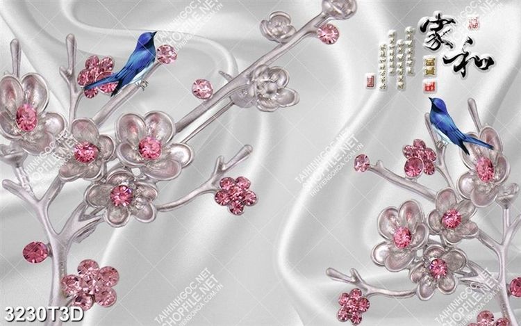 Tranh lụa hoa anh đào ghép và chữa hán in kính