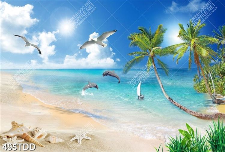 Tranh psd đôi cá heo nhảy múa trên bãi biển