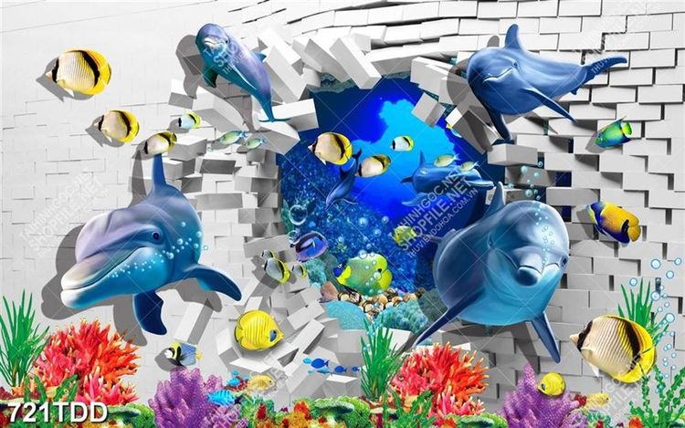 Tranh 3D cá heo và san hô trang trí tường của bé