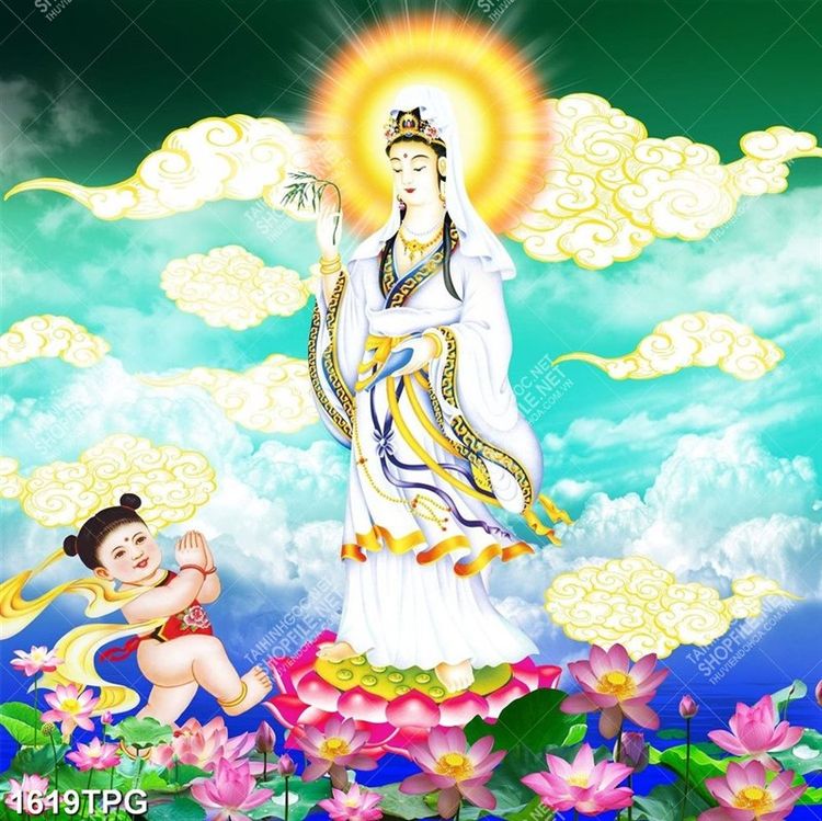 Tranh Phật Quan Âm và tiên đồng trên trời