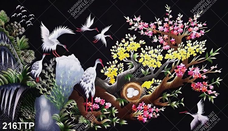 Tranh thư pháp treo tường đàn chim hạc và hoa