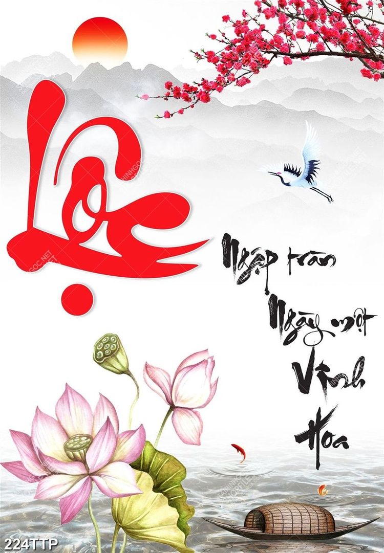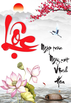 Tranh thư pháp trang trí chữ lộc bên con đò nhỏ