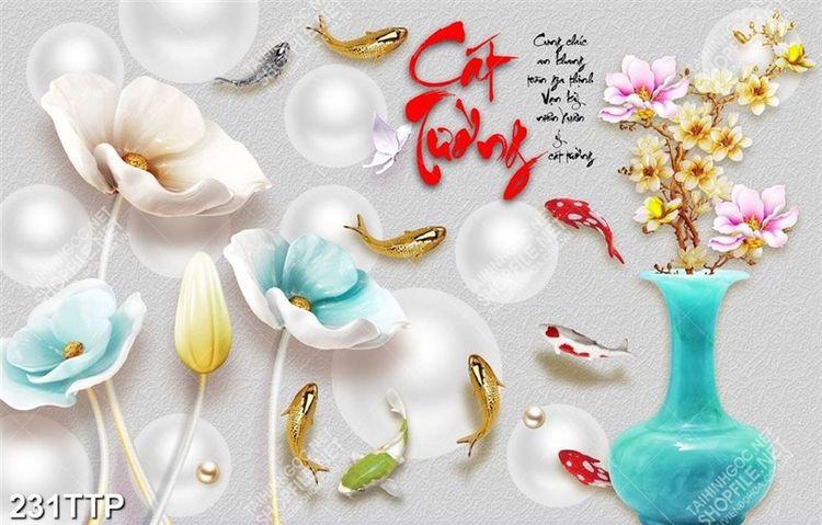 Tranh thư pháp in canvas đàn cá chép bên hoa