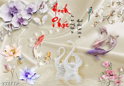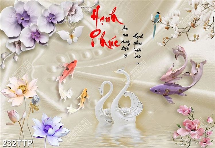 Tranh thư pháp treo tường đàn cá chép bên hoa