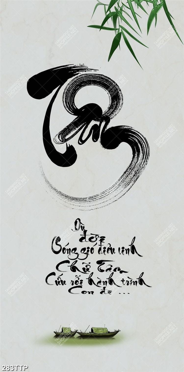 Tranh thư pháp psd chữ tâm bên con đò trên sông