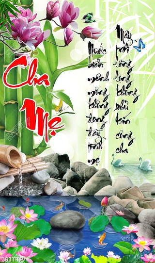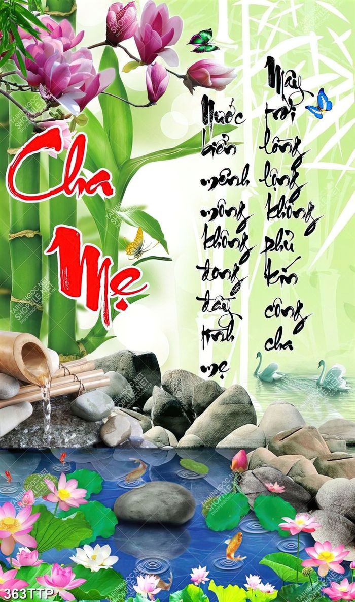 Tranh thư pháp in 3d cành hoa mộc lan bên con suối