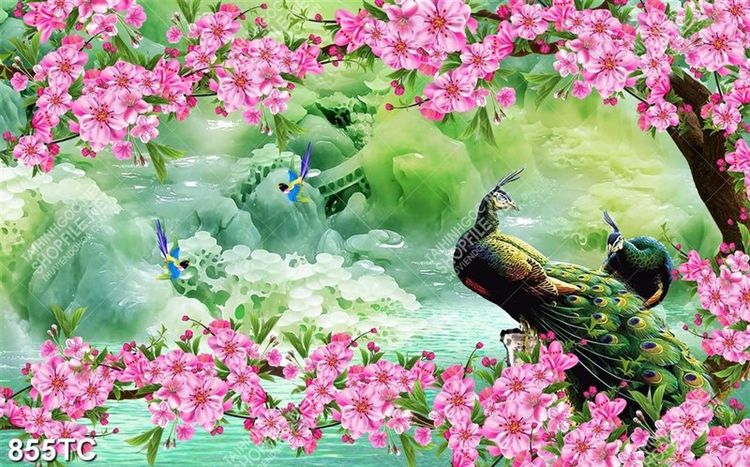 Tranh chim công và hoa đào mùa xuân nền giả ngọc