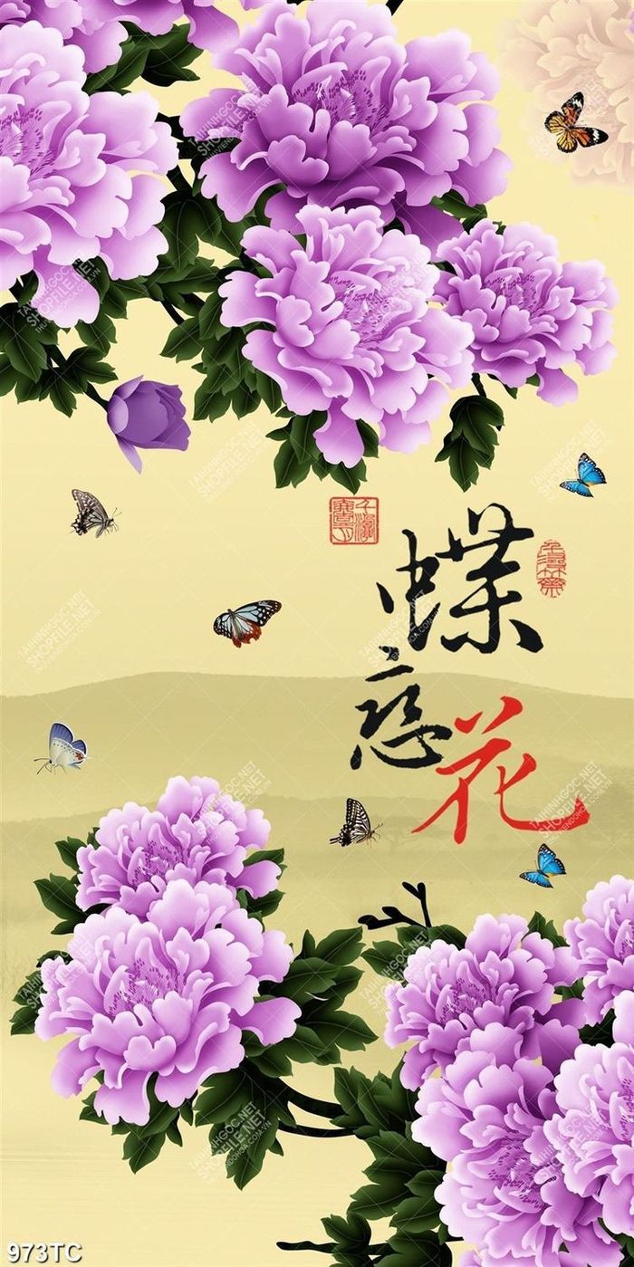 Tranh hoa mẫu đơn tím thư pháp đẹp