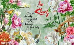 Tranh thư pháp an khang và hoa mẫu đơn chim công