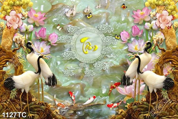 Tranh thư pháp chữ Tâm và chim Hạc nền giả ngọc