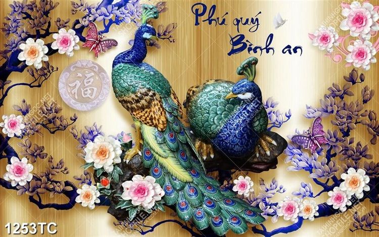 Tranh chim công thư pháp phú quý bình an