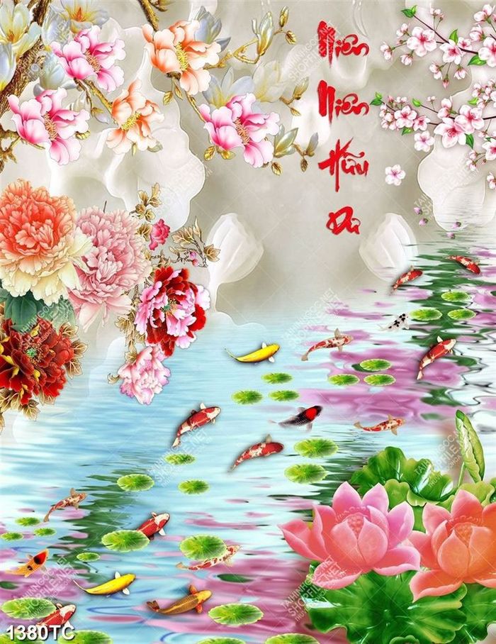 Tranh cá chép hoa mẫu đơn và hoa mộc lan