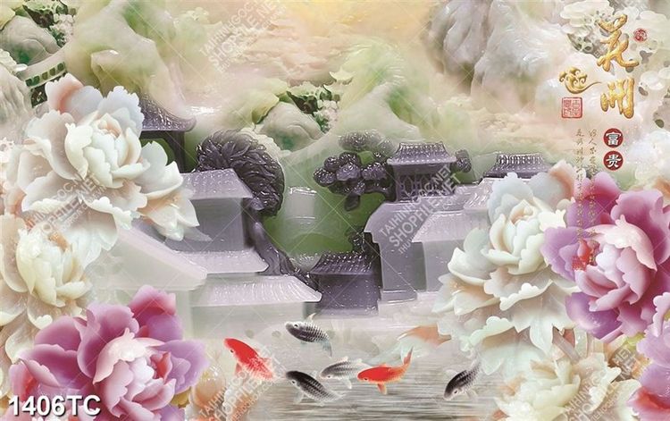 Tranh cá chép hoa mẫu đơn nền giả ngọc