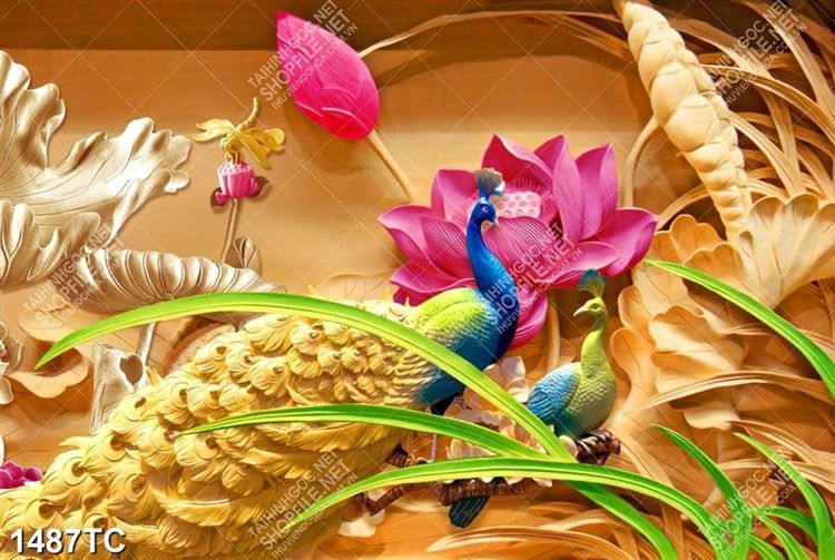 Tranh chim công và nền hoa Sen điêu khắc gỗ