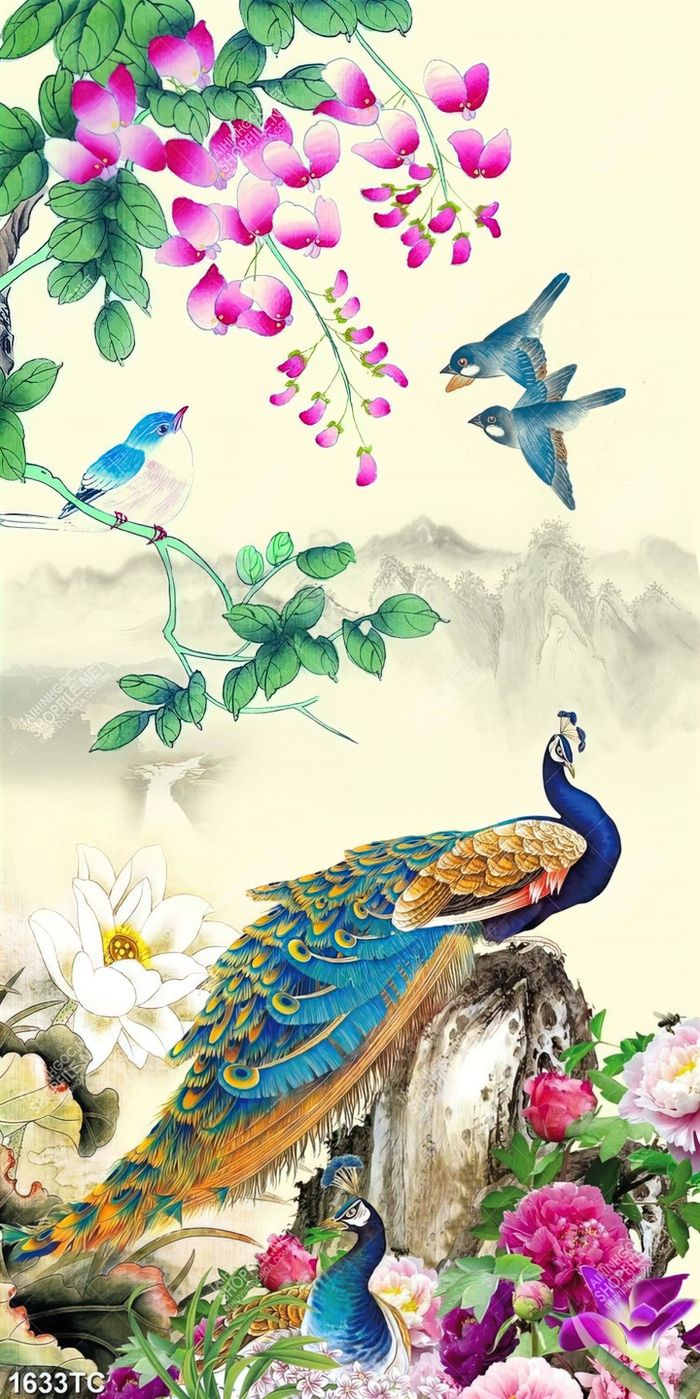 Tranh chim công và hoa mẫu đơn in dán tường đẹp