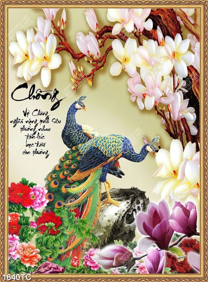 Tranh thư pháp Vợ Chồng và đôi chim công