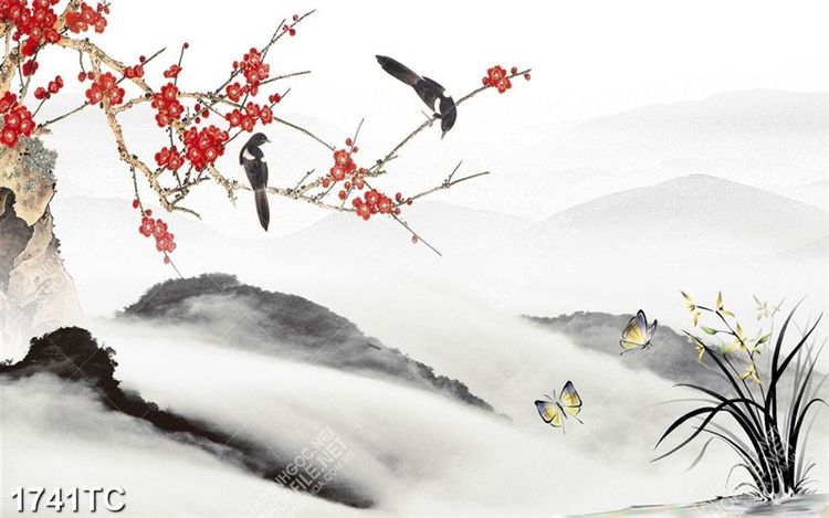 Tranh hoa đào và núi