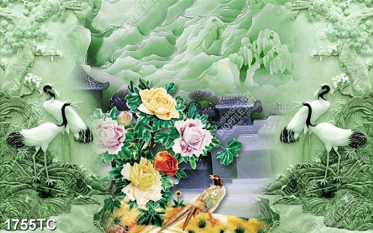 Tranh gải ngọc chim Hạc và hoa mẫu đơn