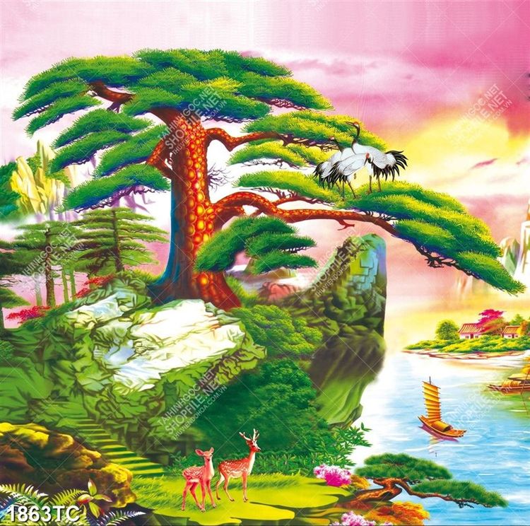 Tranh sơn dầu cây từng và chim hạc