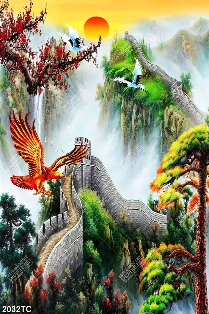 Tranh hoa đào vạn lý trường thành in kính đẹp