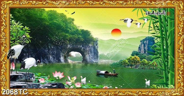 Tranh sơn thủy và chim Hạc
