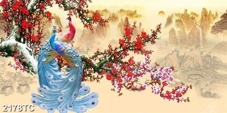 Tranh chim công và hoa đào mùa xuân