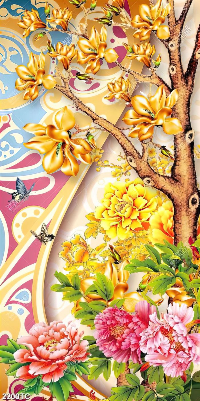 Tranh cây tài lộc và hoa mẫu đơn