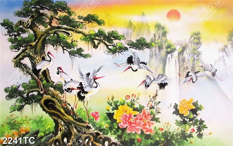 Tranh sơn dầu và chim Hạc in kính đẹp