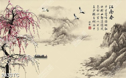 Tranh cây đào và phong cảnh sông núi