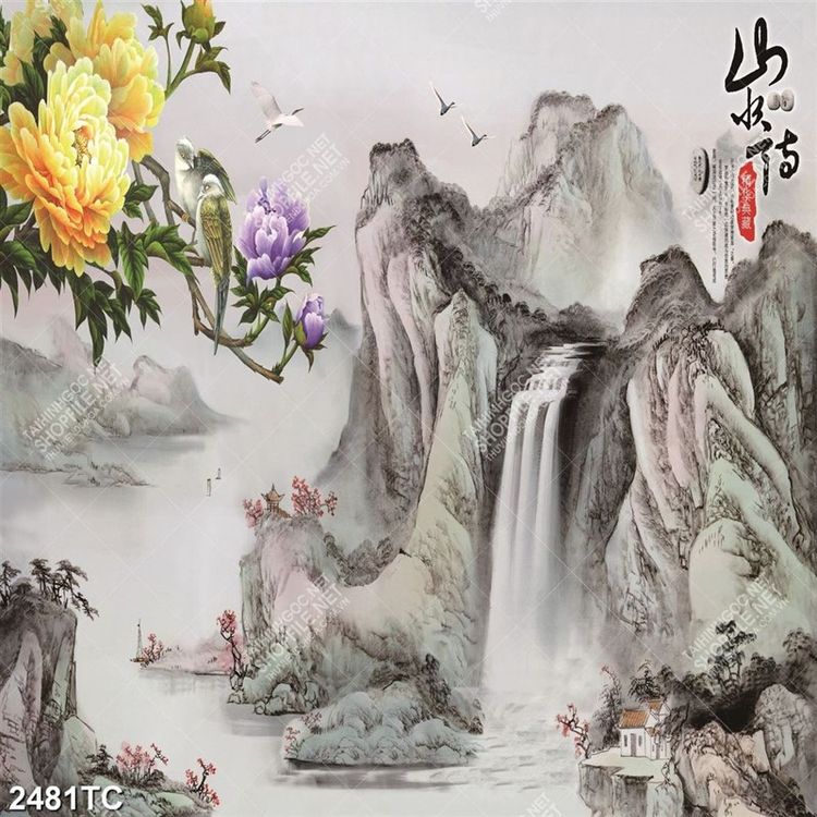 Tranh hoa mẫu đơn nền tranh thủy mặc