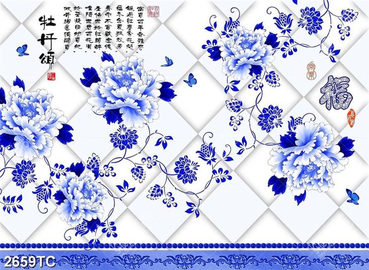 Tranh thư pháp hoa mẫu đơn xanh in dán tường