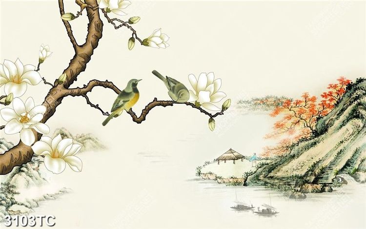 Tranh hoa mộc lan và núi