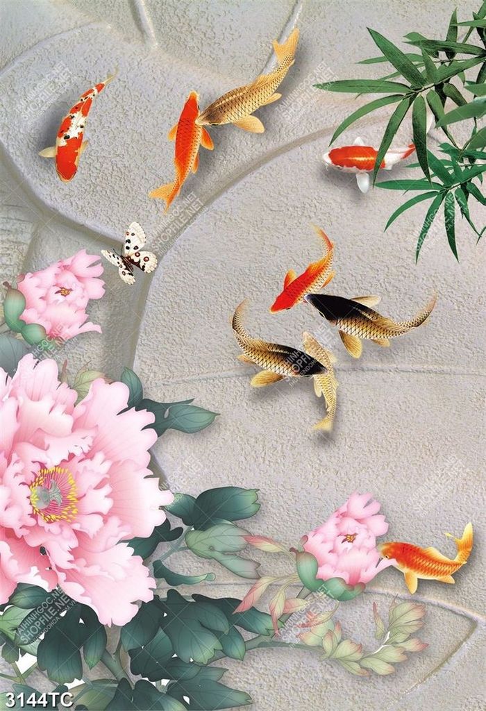 Tranh hoa mẫu đơn và cá chép nền 3D