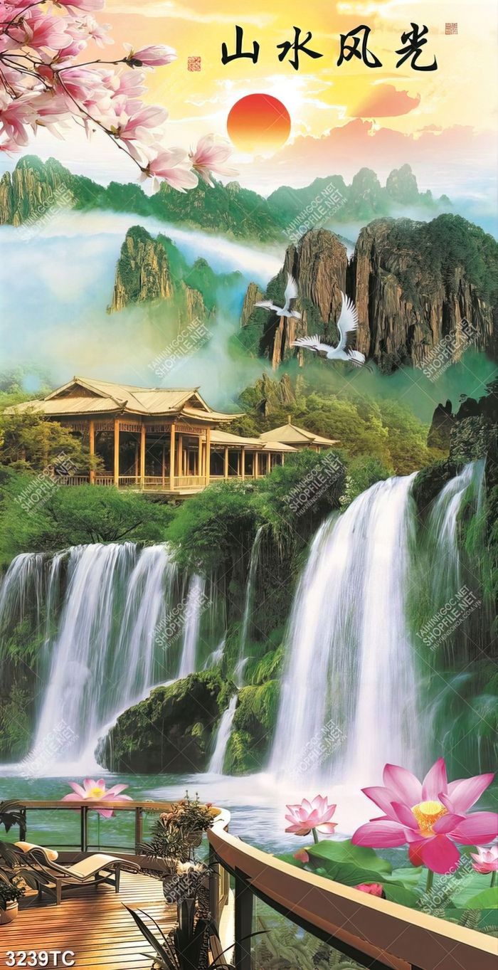 Tranh thác nước phong thủy thư pháp