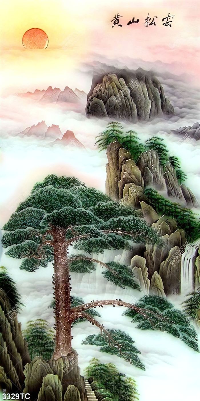 Tranh sơn dầu cây tùng và núi