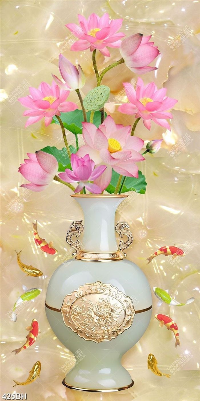 Tranh bình hoa sen hồng và đàn cá koi trang trí