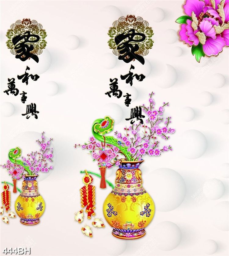 Tranh bình hoa in uv cành hoa đào bên lông chim công