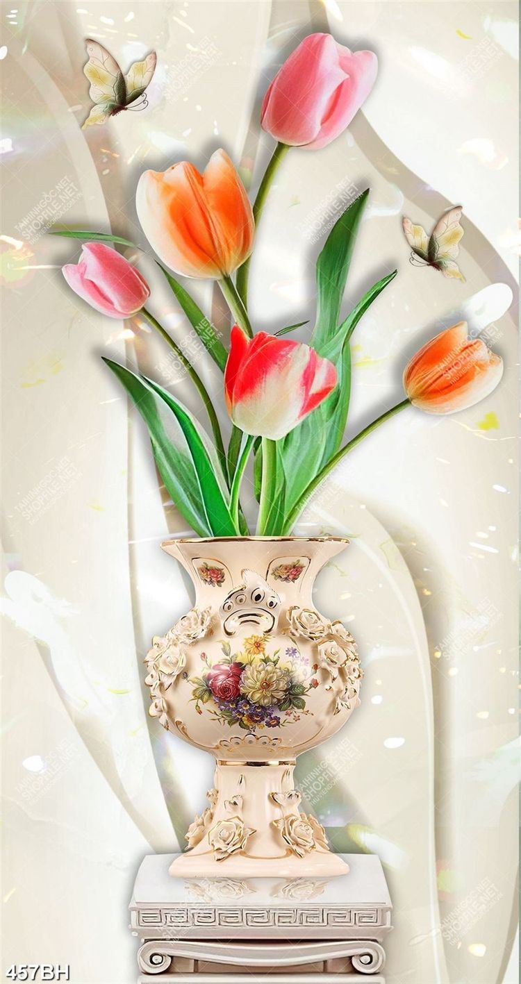 Tranh bình hoa tulip bên chú bướm xinh đẹp dán tường
