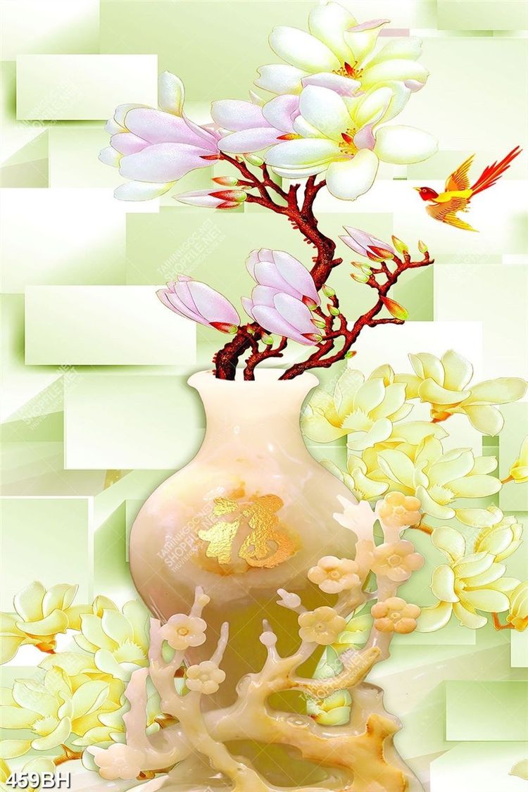 Tranh bình hoa mộc lan bên cành hoa mai nghệ thuật