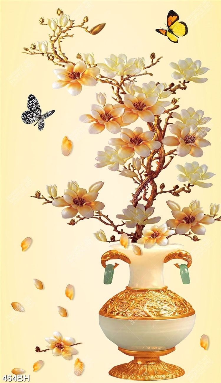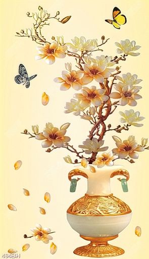 Tranh bình hoa in 3d cành mộc lan bên chú bướm xinh