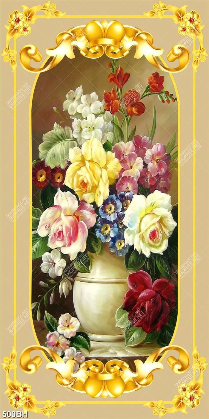 Tranh bình hoa hồng nhiều màu sắc trên bàn tiệc 3d