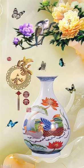 Tranh bình hoa in canvas cành hoa mẫu đơn bên đôi chim non