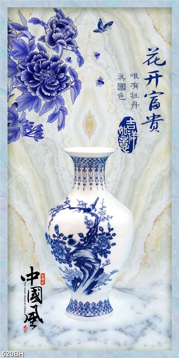 Tranh bình hoa dán tường chiếc bình gốm bên mẫu đơn xanh