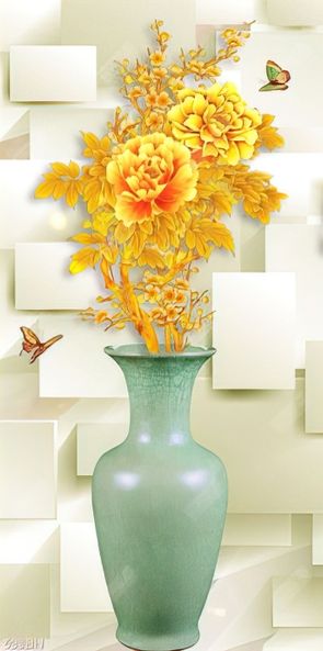Tranh bình hoa dán tường bông hoa mẫu đơn bên chú bướm
