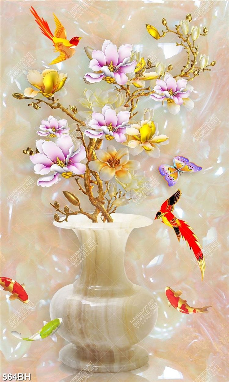 Tranh bình hoa in canvas chim ri bay lượn bên hoa mộc lan