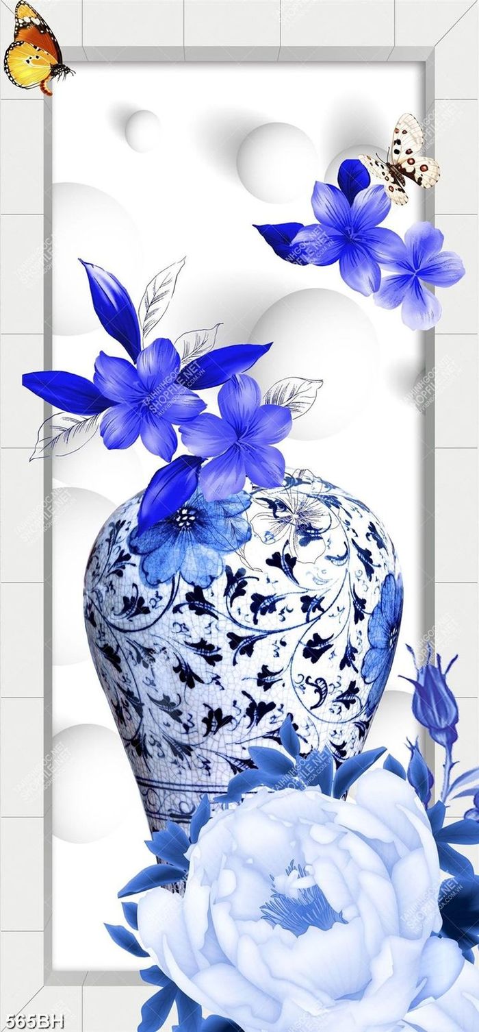 Tranh bình hoa dán tường những bông hoa màu xanh lam