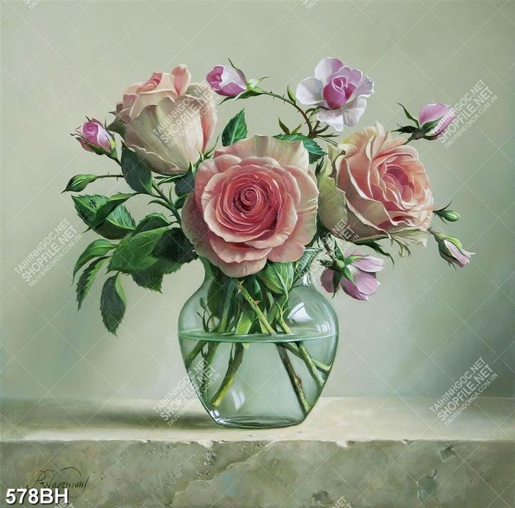 Tranh bình hoa trang trí hoa hồng nhung trong bình thủy tinh