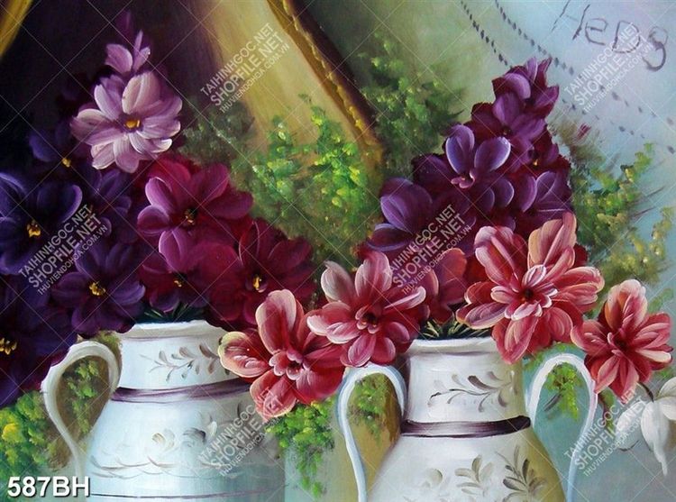Tranh bình hoa 3d hoa tím bên những bình gốm dán tường
