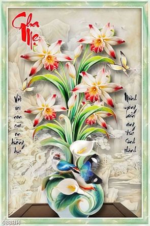 Tranh bình hoa psd cành hoa phong lan trên tường ngọc bích