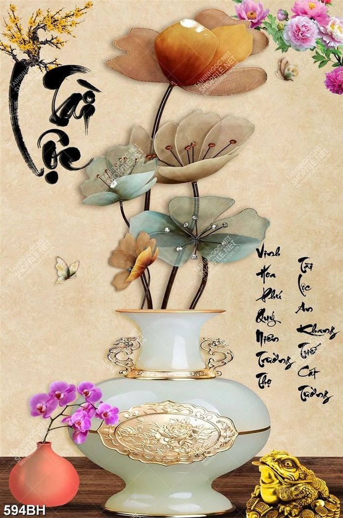 Tranh bình hoa in uv bông hoa phù du màu xanh bên chú bướm